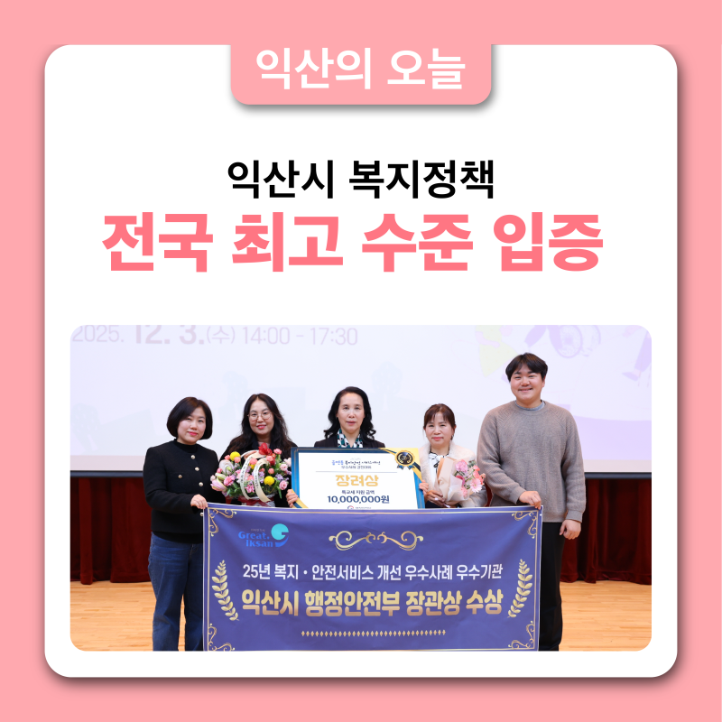 익산시가 복지·안전 서비스 우수사례로 행정안전부 장관상을 수상했습니다!